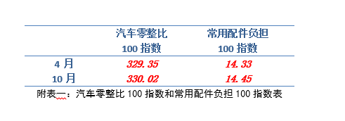 两协会按照汽车零整比100指数的编制规则,通过公开市场采集更新了各车型的配件价格(价格数据截至到9月),导入计算公式核算各车型的零整比系数,编制完成本期汽车零整比100指数[1],并同步更新测算了消费者常用配件负担100指数[2]。本期汽车零整比100指数为330 真人百家乐,02%;消费者常用配件负担100指数为14,45,两项指数同比2016年4月均呈小幅上涨态势。。
