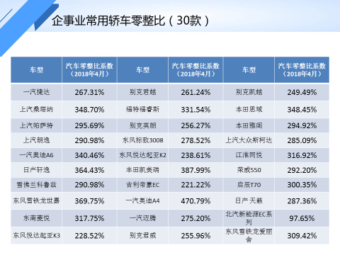 企事业常用车型零整比(2018年4月)